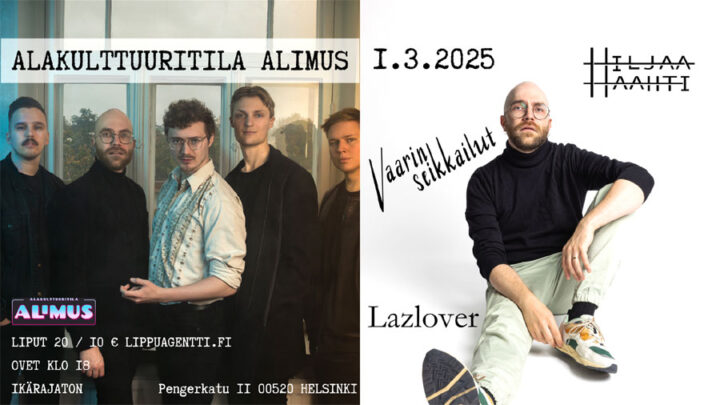 Helsingin Kalliossa tapahtuu lauantaina 1.3.: Kolmen bändin ilta Alakulttuuritila Alimuksessa – luvassa virtuoottista musisointia ja sykähdyttävää bändienergiaa kolmen bändin voimin. Illan pääesiintyjänä soittaa Vaarin seikkailut.