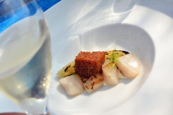 Kevyesti savustettuja kampasimpukoita, fenkolia ja suolaheinää