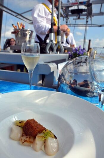 Asiakkaat saavat alkupalat eteensä jo nostovaiheessa ja henkilökunta valmistelee ravintolakorissa samalla pääruokia tarjolle. Äärimmäisen taitavat, Michelin-tähditetyistä ravintoloista tulevat keittiömestarit ovat kuitenkin varautuneet monin tavoin poikkeukselliseen tilanteeseen menuja loihtiessaan, jotta herkut eivät esimerkiksi lentele lautasilta tuulen mukana. Kokemusta Dinner in the Sky -nostoista on kummallakin. Samuli oli ensimmäistä kertaa taivaisena kokkina vuonna 2011 Tallinnassa.