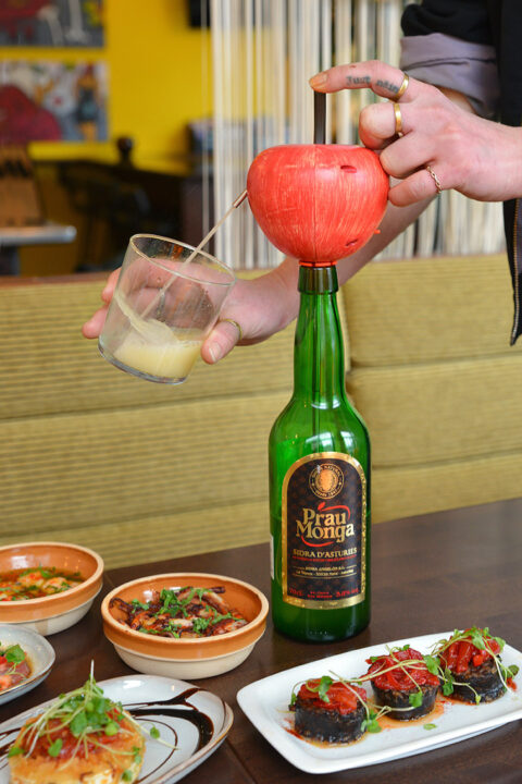 – Baskimaassa ja Asturiassa kuplaton sidra natural kaadetaan aina korkealta tasapohjaiseen lasiin. Siinä on vähän show-elementtiäkin, mutta lasin pohjaan pirskahtaen iskeytyessään siideri ilmaantuu ja saa pikkuista kuplaa. Samalla sen aromit avautuvat, valaisee Suihkonen.