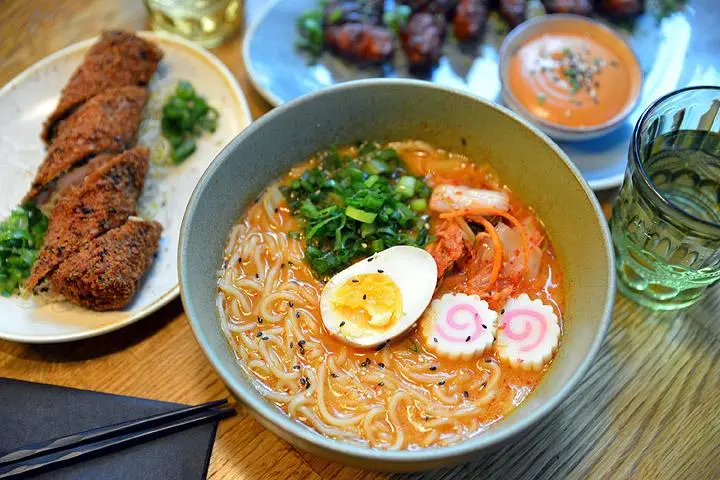 Ramen-komeuden kruunaavat naruto-kalakakku sekä soijamarinoitu kananmuna.