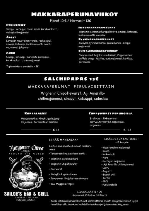 Sailor’s Bar & Grill on katuruokaklassikoihin erikoistunut ravintola, jonka keittiössä valmistetaan kursailematonta mutta laadukasta grilliruokaa. 15.11.–15.12. baarissa vietetään jo toista kertaa makkaraperunaviikkoja, jolloin tarjolla on niin klassikoita kuin kokeilevampiakin annoksia paikallisten tuottajien makkaroista.