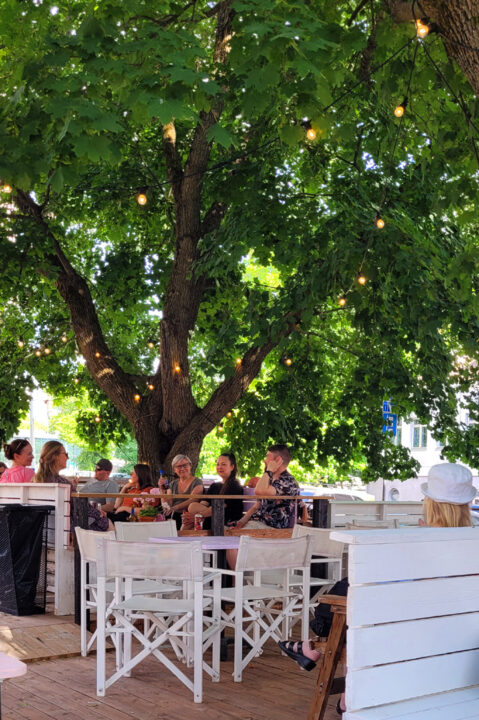 Aurinkoisella säällä otetaan kaikki ilo irti kesäpäivästä, ja cocktaileja sheikataan iltakahdeksaan asti – vain puiden katveessa sijaitsevalla terassilla.