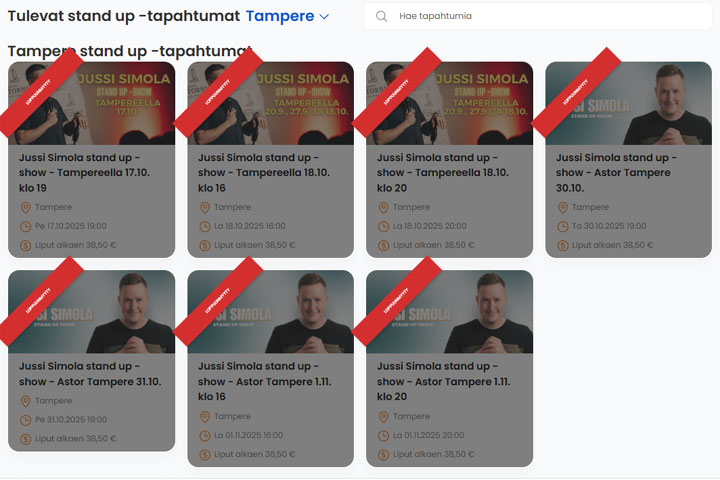 Kuvakaappaus Jussi Simolan keikkatilanteesta 17.10.2025. Jussi Simolalla on ollut syksyn aikana enemmänkin loppuunmyytyjä stand up -tapahtumia Tampereella samanaikaisesti.