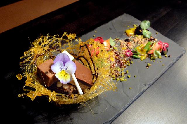Luovuus rönsyilee ja kukkii suloisesti myös jälkiruokien saralla. Erityisesti sykäyttää suklaaunelma, jonka itse säikeilty sokerikori hellii sisällään omatekoisia suklaisia suupaloja: valkoista, tummaa, minttua, pähkinää, lakkaa, karamellia… Idean annokseen Otto sai linnunpesämäisestä kuvasta, joka sinällään muistuttaa hänen omaa luomustaan perin etäisesti. Mutta inspiraatiokuva napattiin talteen ja mieleen muhimaan. Kun silmiin osui sitten Jali ja suklaatehdas -elokuva, oli idea valmis: syötävä kupillinen erilaisia suklaamakeisia. Yksi niistä ehdottomasti suklaisen tikkukaramellin muodossa. Unelmallista.