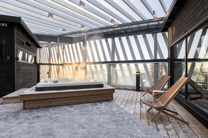 Ravintola Periscopen kattoterassilla saunoja ja jacuzzi-poreilua