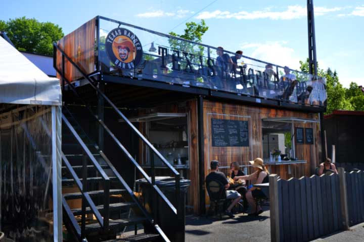 Texas Ranger BarBQ:ssa patongin voi huuhtoa kurkunkannesta alas niin kotimaisilla virvokkeilla kuin Olvin oluellakin. Katutason pystybaarista pääsee kapuamaan konttiravintolan katolle, jossa ruokia voi maistella puukalustein kalustetulla, Tammelan korkeimmalla kesäterassilla.