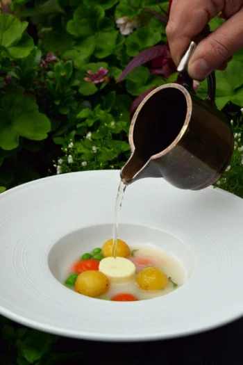 Joka vuosi yhtä odotettu kesämenukokonaisuus alkaa tänä suvena Tiiliholvin tapaan valmistetulla kesäkeitolla. Lautasen pohjalle kesäisten perunoiden, herneiden ja porkkanapyreen päälle on aseteltu kermainen kukkakaalipannacotta. Kun sen päälle kaadetaan kuuma kasvisliemi, tapahtuu asiakkaan silmien edessä kesäkeittotaika.