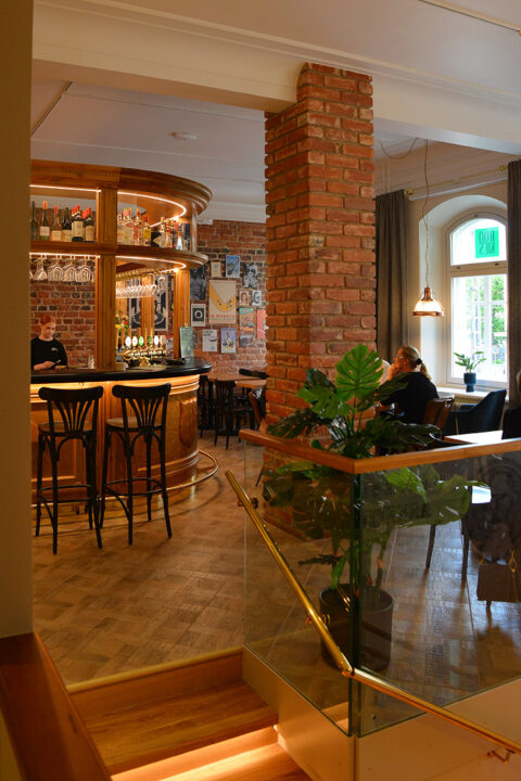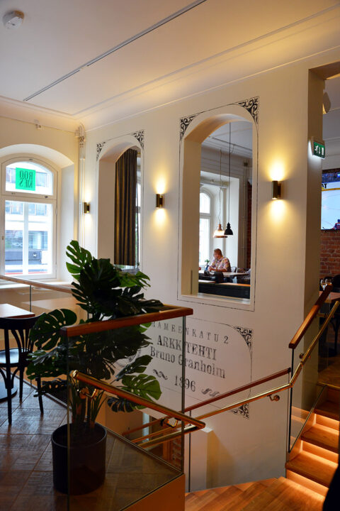 – Mielestäni on hienoa, että täällä on kaksi erilaista kerrosta ja vielä useita erilaisia tiloja. Alakerrassa on esimerkiksi mukava ja suojaisa oman rauhan pubinurkkaus, jossa seurata urheilua. Ylhäällä taas on valoisa lounge-tyylinen tila kaari-ikkunoineen ja ikkunapöytineen, jossa istuskella viinillä. Lisäksi löytyy helposti kabinetiksikin muovautuva tila, Nurmenniemi kuvailee.