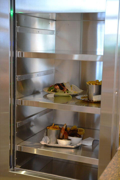 Sitten se ruokahissi. Jos annoksensa tilaa yläkerrassa, se saapuu keittiöstä hissillä. Tilauksen yhteydessä ruokailijalle mukaan annettu kiekko hälyyttää, kun annos on matkalla ja valmis noudettavaksi hissistä. Ja kun annos on hyppysissä, nakataan kiekko verk… koriin. Maali!