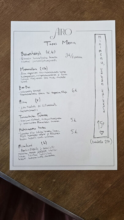 Tapas-valikoimassakin on samaa luonnonapajien antimia arvostavaa tekemistä, sillä niin järvikaloja kuin riistaakin hyödynnetään reippaasti. Tällä hetkellä makuina on muun muassa riimihirveä, rusakkoa, kylmäsavustettua haukea sekä Tammerkosken yläjuoksulta kalastettua sokerisuolattua taimenta. Myös kasvis- ja vegaanisia vaihtoehtojakin on, kuten esimerkiksi Airon versio vegaanisesta mustamakkarasta.